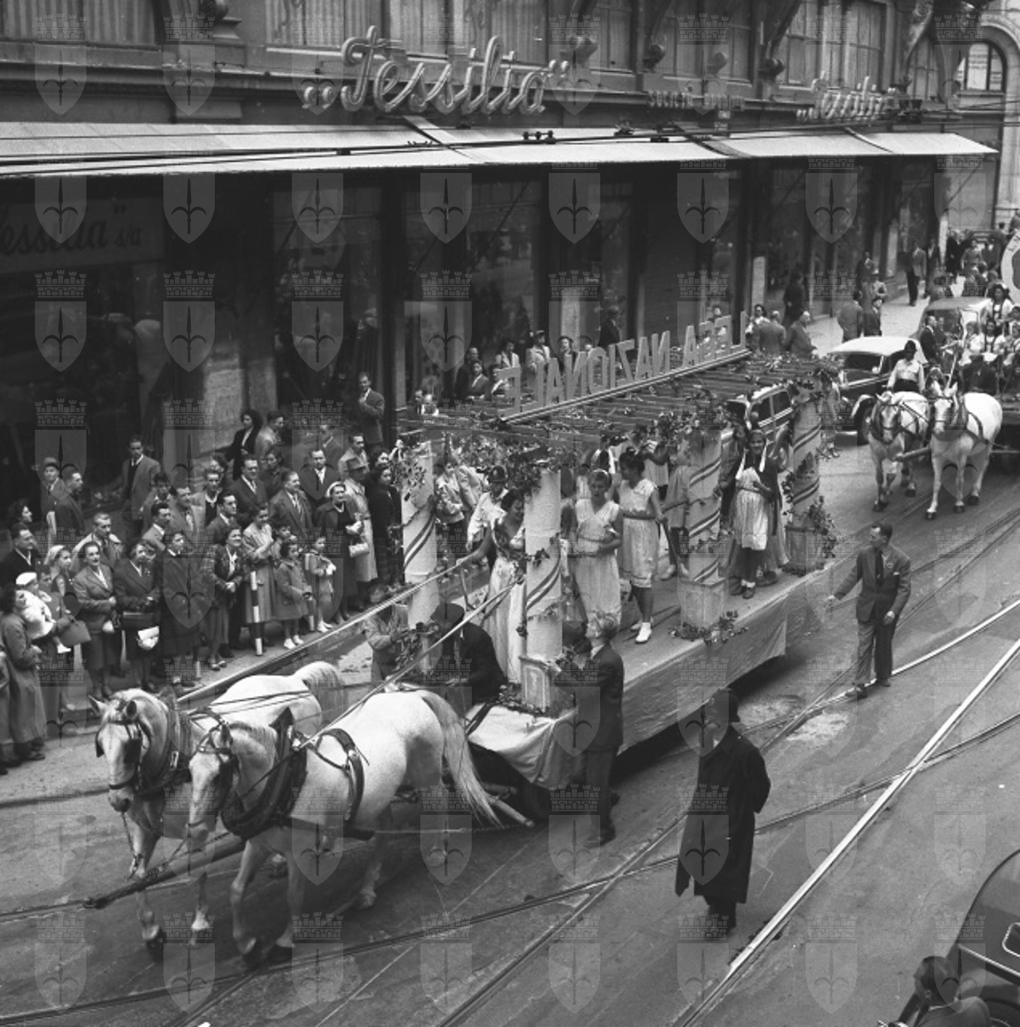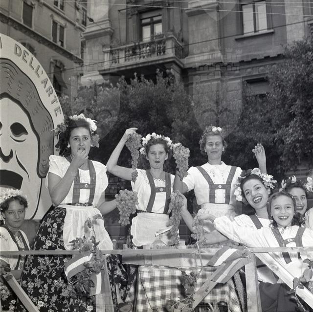 Sfilata di carri allegorici per le vie del centro; Ketty Burba, Miss Trieste 1951, in posa accanto ai grappoli; festa al castello di San Giusto.