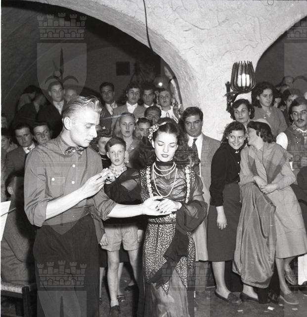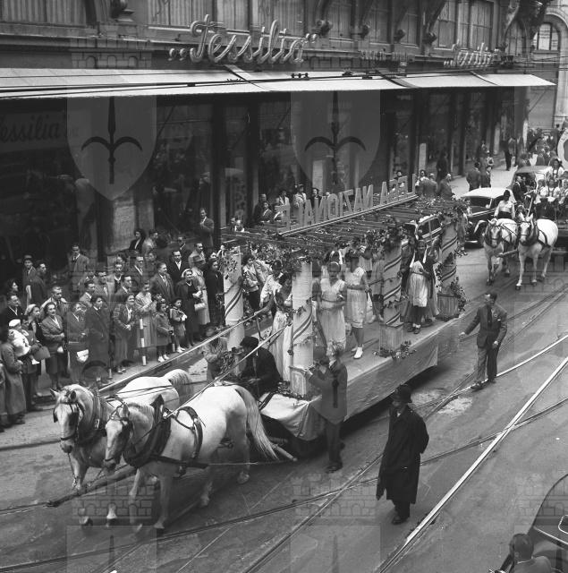 Sfilata di carri allegorici per le vie del centro; Ketty Burba, Miss Trieste 1951, in posa accanto ai grappoli; festa al castello di San Giusto.