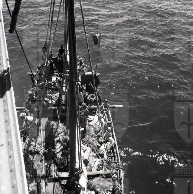Immagini di una barca somala con a bordo passeggeri ripresa dalla Motonave Africa.