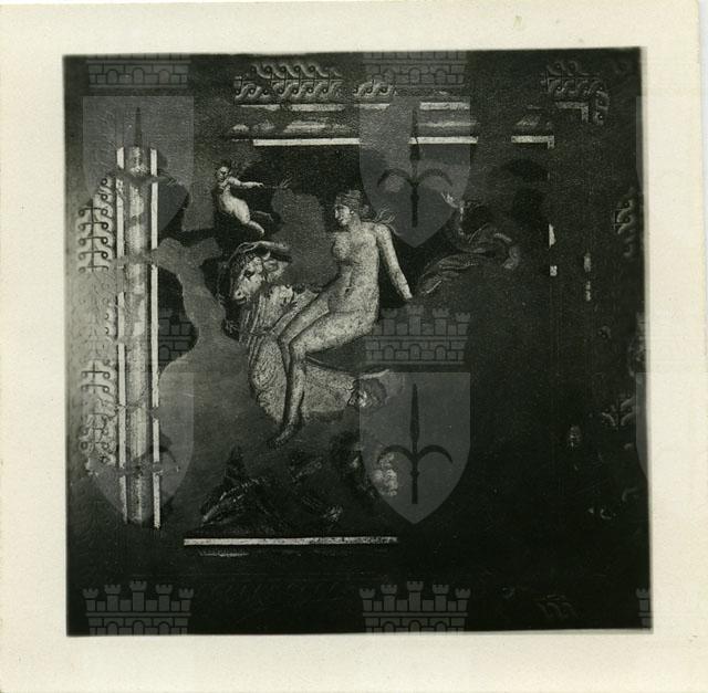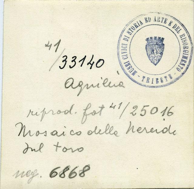 Mosaico rinvenuto nel 1859 nei fondi Cossar, staccato al momento della scoperta e conservato presso le gallerie lapidarie del Museo Archeologico Nazionale di Aquileia. All'interno di un'elaborata cornice con effetto tridimensionale, costituita da una treccia a calice seguita da un cordone con nastro avvolto, si staglia, su un campo nero, una Nereide su toro marino. La figura femminile presenta lunghi capelli biondi trattenuti sul capo da un nastro ed è ritratta in nudità, seduta di tre quarti su un toro bianco con coda pisciforme. L'animale è ornato attorno al muso da una ghirlanda, che la fanciulla tiene con la mano destra. Precede la raffigurazione un erote in volo, che si rivolge alla coppia mitologica trattenendo con la mano sinistra una fiaccola accesa e con la destra un dardo. Sotto il toro emerge dai flutti un personaggio maschile barbato, ritratto anch'esso in nudità, con il braccio destro proteso sulla testa di un delfino guizzante. La cronologia del mosaico è dibattuta, tuttavia è probabile che l'opera vada inquadrata nella seconda metà del I sec. a.C. per l'evidente dipendenza dalla tradizione ellenistica - ben visibile, ad esempio, nella concezione dell'immagine che occupa l'intera superficie, nell'iconografia del soggetto, nella scelta dei motivi di bordura, ecc.
