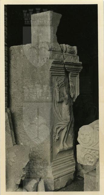 Fianco sinistro dell'ara di Albius Vitalis, presso il Museo Archeologico Nazionale di Aquileia. Il monumento, realizzato in calcare d'Aurisina, presenta sul lato frontale l'iscrizione dedicatoria, che recita: Memoriae Albi Vìtalis IIIIIIviri, C(aius) Vennonius Primus, amìcus. Le facce laterali ospitano invece la raffigurazione di un personaggio maschile togato e di una figura femminile, quest'ultima visibile nella foto. La donna è avvolta nel nimbo del mantello che si apre al vento e regge un mazzo di spighe e un papavero, elementi che la collegano al mondo dei morti, suggerendone l'identificazione con una danzatrice di Dioniso-Zagreo, secondo l'ipotesi di G. Brusin. Il monumento si data verso la fine del I - inizio del II sec. d.C.
