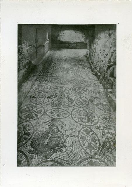 Pavimento musivo dell'aula nord della Basilica teodoriana di Aquileia. La foto è stata scattata in corrispondenza dell'angolo nordoccidentale dell'aula e mostra in primo piano il pannello musivo decorato da una composizione reticolata di fusi e di cerchi tangenti, formante ottagoni concavi irregolari. Questi ultimi presentano riempitivi figurati di cui sono visibili nella fotografia coppie di volatili affrontati a cespi fioriti, un toro che regge un'asta a cui è legato un falcetto e un capro con bastone ricurvo e corno. Nei cerchi vi sono nodi di Salomone e fioroni mentre i fusi sono campiti con fioroni longiformi. A sud il pavimento è interrotto dalle fondamenta del campanile, costruito in un momento successivo. Il pavimento si data nella seconda metà del IV sec. d.C.