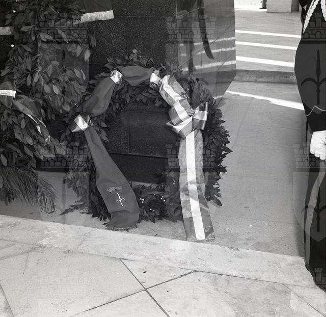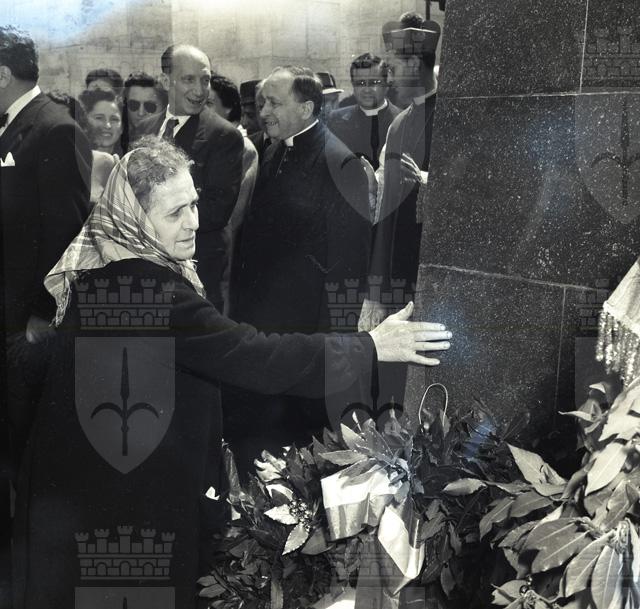 Folla presenzia alla cerimonia di inaugurazione dell'Ara Pacis Mundi di Medea. Cartellone sul muro di una casa: Sottocentro fecondazione artificiale. Uomo al volante di un'automobile