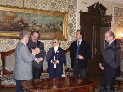 Il sindaco Roberto Dipiazza con il presidente del consiglio comunale Bruno Sulli ed l'assessore comunale Roberto Menia, durante l'incontro con la signora Fulvia Costantinides e suo figlio Fulvio, nel salotto azzurro del Municipio.