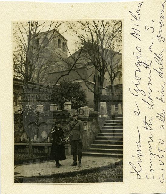Lina e Giorgio Milani fotografati nell'Orto Lapidario davanti al Museo di Storia ed Arte, con la cattedrale di San Giusto sullo sfondo, alla fine della Prima Guerra Mondiale. La fotografia è incollata su un cartoncino sul quale il figlio dei due coniugi ritratti ha scritto a penna la richiesta, indirizzata al sig. Stener, di pubblicare la foto sulla rivista Borgolauro. Si legge inoltre: "[...] Mia mamma ha sposato mio padre nel 1914 lui si è offerto volontario per un anno ed è stato tenuto sotto le armi fino alla fine della guerra nel 1918 diventando alla [...]". La scritta è purtroppo lacunosa.