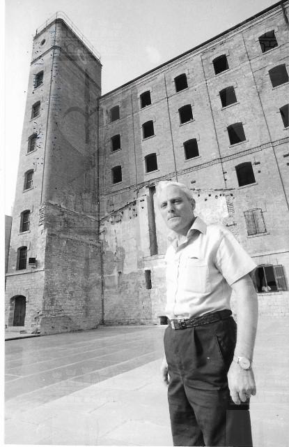 Mario Montanaro in cortile. Edificio centrale e piastra del forno sullo sfondo