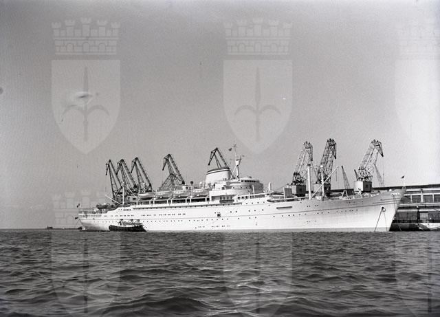 Vista del porto Duca d'Aosta con ormeggiate molte navi : Africa, Risano, Sebastiano Caboto (tutte di proprieta' del Lloyd Triestino di navigazione) e Etna.