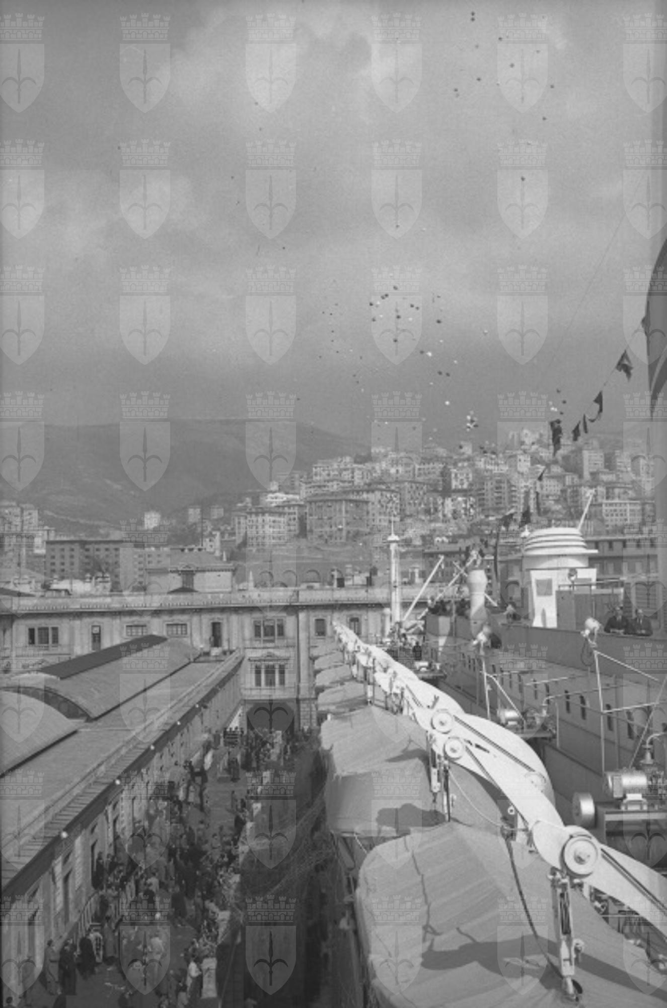 Sale interne e spazi esterni della motonave Augustus, fotografati durante la crociera inaugurale. Vedute del porto di Genova.