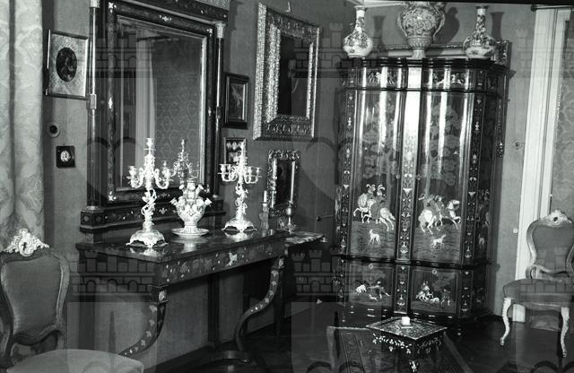 La splendida camera da letto di Draga Obrenovic, regina di Serbia, moglie del re Alessandro, composta da mobili olandesi intarsiati d'avorio. Draga e Alessandro, convolati a nozze nel 1900, furono assassinati la notte del 10 giugno 1903, proprio in questo letto: una congiura di palazzo pose fine alla dinastia degli Obrenovic, per insediare sul trono Pietro Karageorgevic. La camera appartenne a una nobile famiglia triestina e fu poi venduta a un celebre antiquario che la riallesti in una villa di viale Terza Armata, dove fu fotografata.