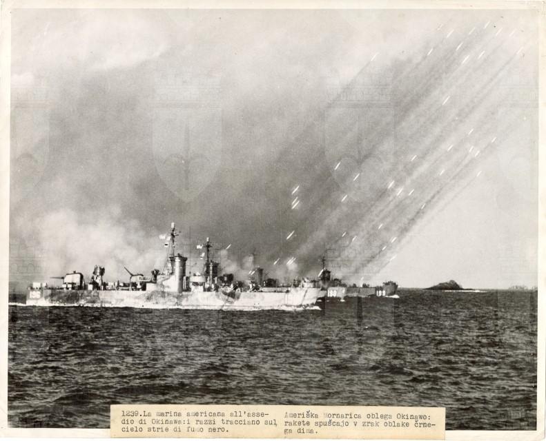 Lancio di razzi americani contro navi giapponesi durante la battaglia di Okinawa.
