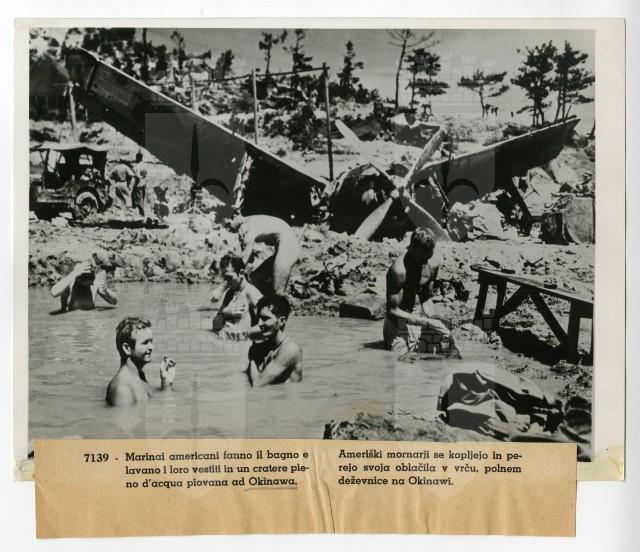 Marinai americani fanno il bagno nel cratere di una bomba pieno d'acqua piovana sull'isola di Okinawa.