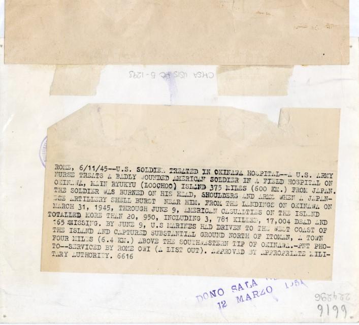 Un'infermiera cura un soldato americano ferito al volto dallo scoppio di una granata giapponese sull'isola di Okinawa