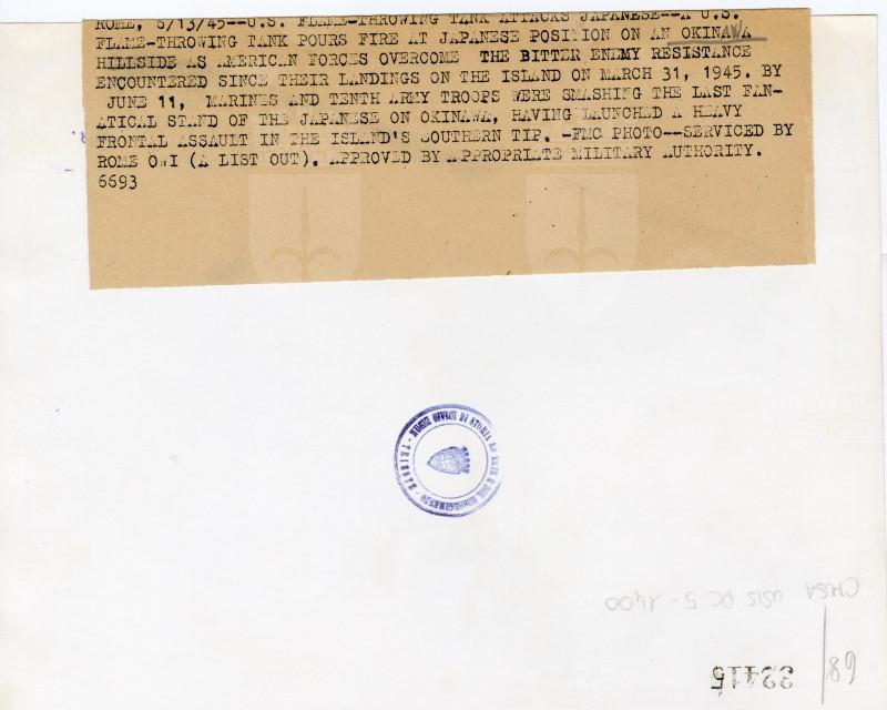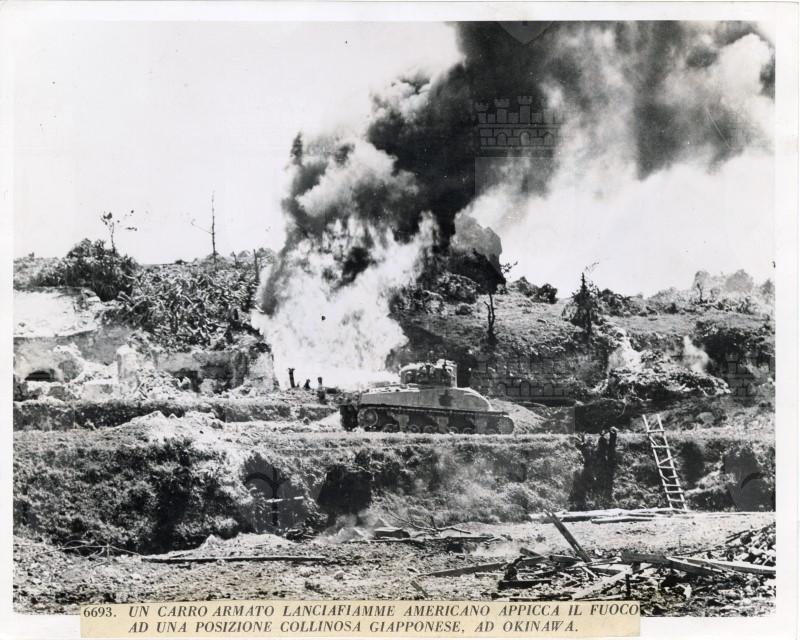 Un carro armato lanciafiamme americano attacca una posizione giapponese sull'isola di Okinawa.