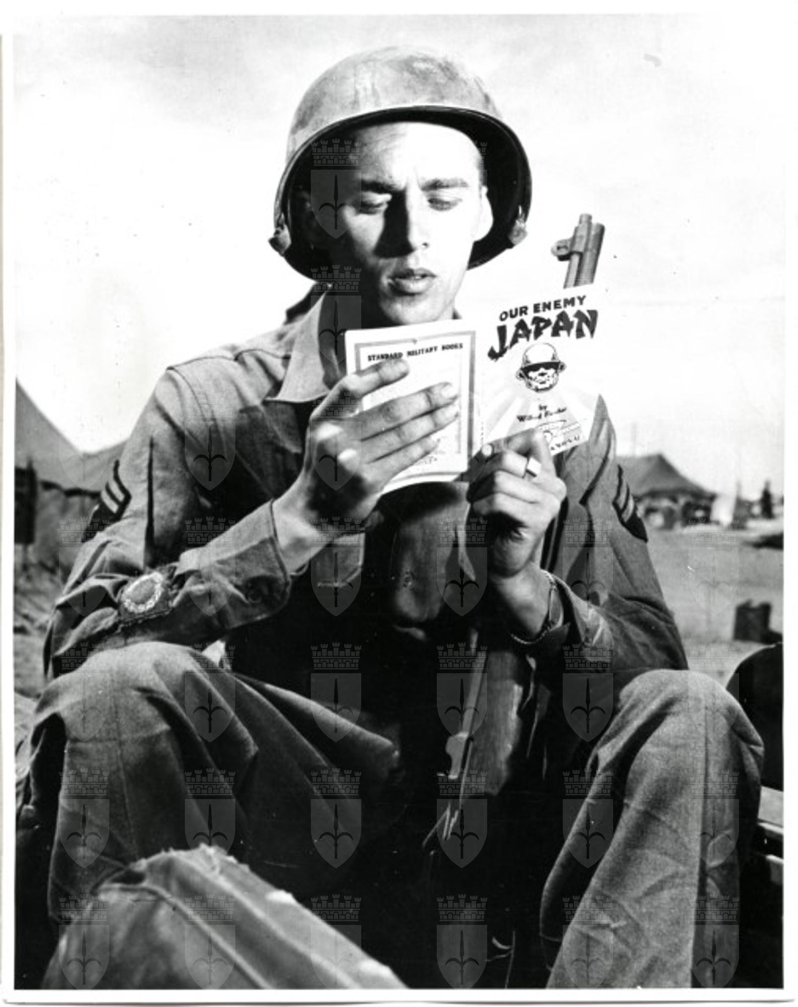 Joseph Melosh in posa mentre legge "Our enemy Japan" di Wilfried Fleisher.
