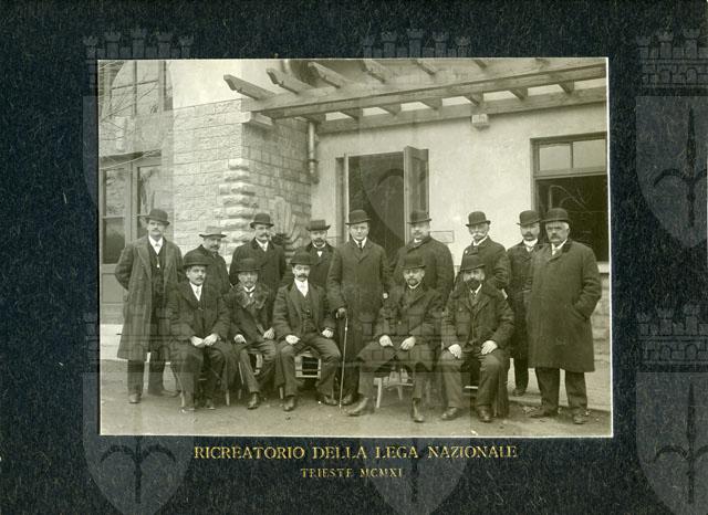 Gruppo di industriali e architetti triestini che hanno costruito e contribuito alla costruzione del Ricreatorio Riccardo Pitteri 1911: da sinistra in piedi:1. Castelreggio, 2 Ferletich, 4 Bonazza, 5 dott. ing. Gino Gartner, 6 Ferdinando Sorn, 8. Cumin, 9. Visintin, seduti: 10. Ziperle, 11. Silligoi, 2 dott. Antonio Petronio, 13. Carlo Cossutta, 14. Separ. La Lega Nazionale acquista un terreno al n. tav. 72, all'angolo delle vie San Marco e Amerigo Vespucci, il 13 aprile 1910. Il 29 gennaio 1911 il nuovo ricreatorio viene aperto in via San Marco 5 ed inaugurato il 18 febbraio con la denominazione Ricreatorio San Giacomo alla presenza del podestà Alfonso Valerio e del presidente della Lega nazionale Riccardo Pitteri.