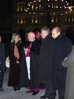Eugenio Ravignani, il sindaco Roberto Dipiazza e Giorgio Rossi davanti al presepe di piazza Unità d'Italia