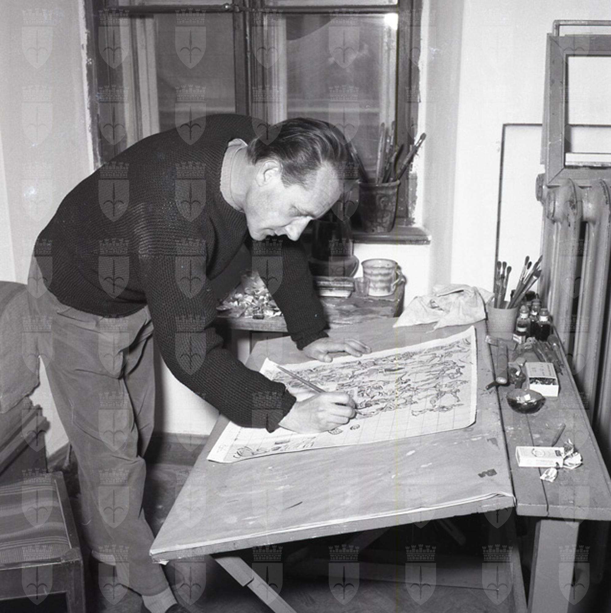 Si tratta in realtà del cartone dell'affresco, con scene di danza con satiri e altre figure mitologiche, che decorava l'atrio del Teatro Nuovo di via Giustiniano a Trieste, sede della Compagnia stabile di prosa, che iniziò la sua attività' il 22 dicembre 1954. Si dice che Righi, coadiuvato dal pittore Carlo Giorgio Titz, abbia eseguito l'affresco in un giorno e una notte. Purtroppo l'opera andò perduta durante i lavori di demolizione dell'edificio, nel 1962, per far posto alla costruzione della sede Rai. Al pittore Riccardo Bastianutto, incaricato di eseguire lo strappo, non arrivò mai il permesso da parte delle autorità competenti.