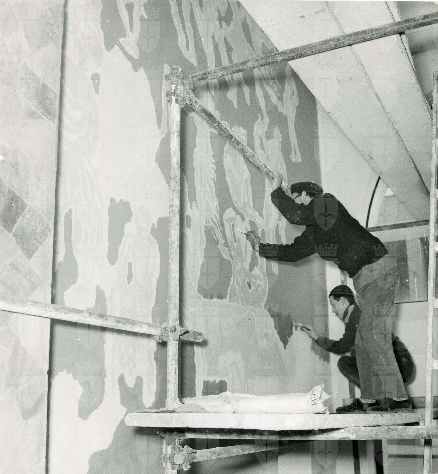 Federico Righi aiutato da Carlo Giorgio Titz dipingono l'affresco, con scene di danza con satiri e altre figure mitologiche, che decorava l'atrio del Teatro Nuovo di via Giustiniano a Trieste, sede della Compagnia stabile di prosa, che iniziò la sua attività' il 22 dicembre 1954.