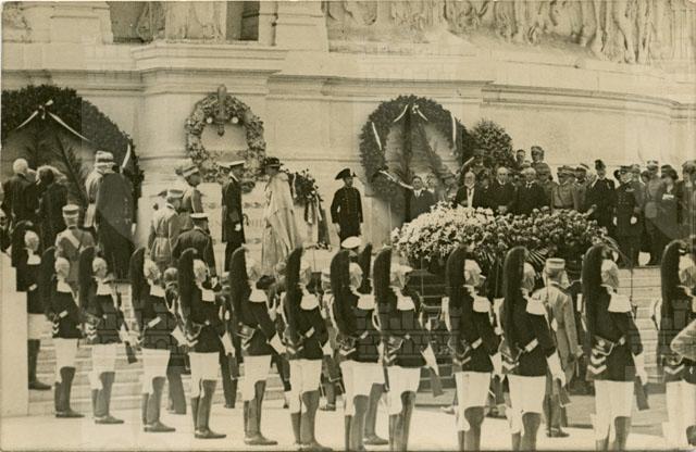 I Re Vittorio Emanuele III e Giorgio V e le Regine Elena e Vittoria davanti al loculo del Milite Ignoto durante la visita dei Reali di Inghilterra nel maggio del 1923 a Roma.