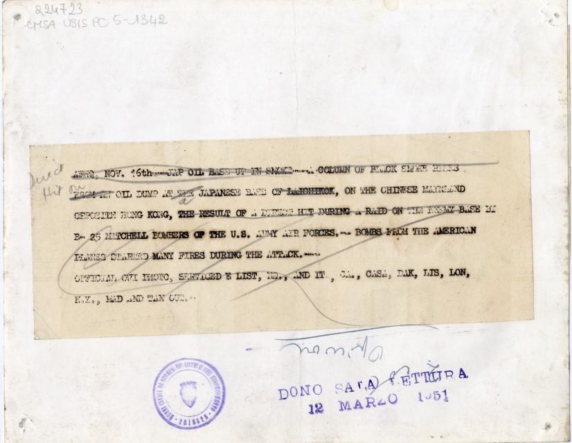 Incendio proveniente da un deposito di lubrificanti giapponesi a seguito di un attacco aereo americano ad Hong Kong.