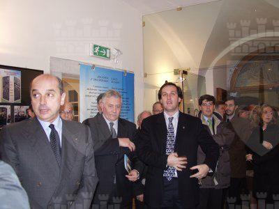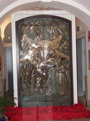 Primo piano della porta della pace, il sindaco Roberto Dipiazza, Roberto Menia, Giorgio Rossi e Padre Aldo Tonini