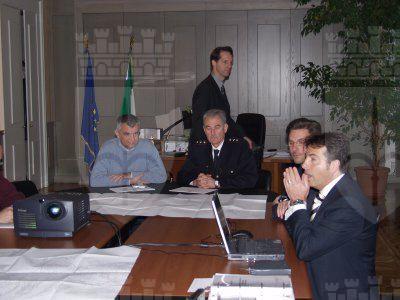 L'assessore comunale Maurizio Bucci ed il consigliere comunale Paolo Rovis durante la presentazione del Piano Neve tenuta nella sala riunioni dell'assessorato in via Genova 6
