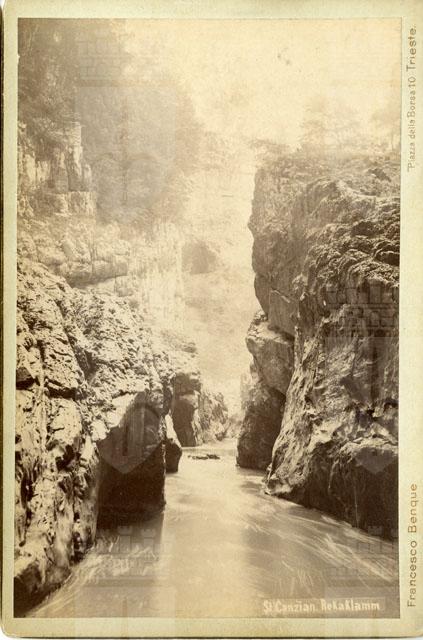 Veduta della forra del fiume Recca (Timavo superiore) a livello dell'acqua nella Grande Voragine (Velika Dolina). Al centro della fotografia, in secondo piano, molto sbiadita, si riconosce l'entrata della cosiddetta Grotta Preistorica. Da questa immagine lo studio Sebastianutti & Benque ricavò cartoline postali in varie edizioni.