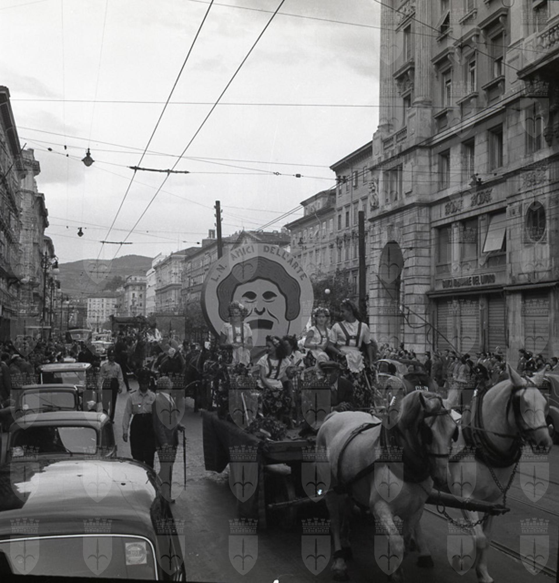 Sfilata di carri allegorici per le vie del centro; Ketty Burba, Miss Trieste 1951, in posa accanto ai grappoli; festa al castello di San Giusto.