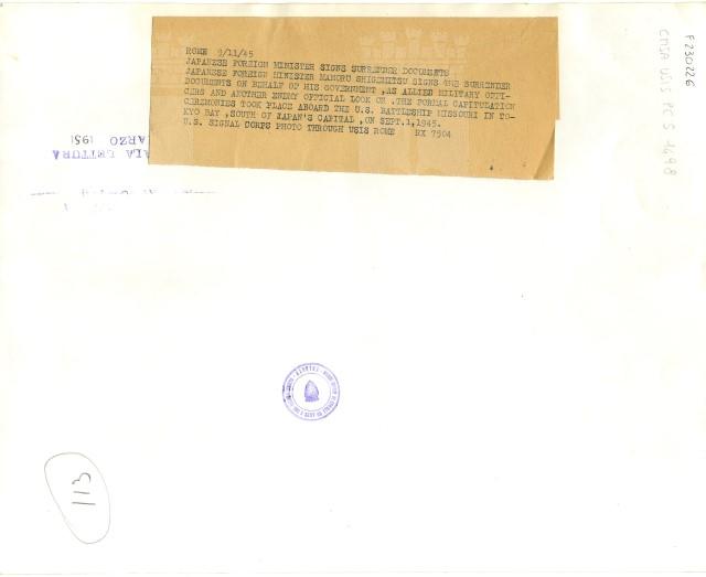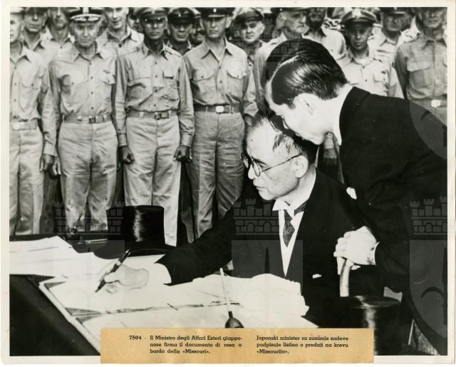 Il Ministro degli Affari Esteri giapponese Mamoru Shigemitsu firma i documenti di resa del Giappone nel settembre 1945.