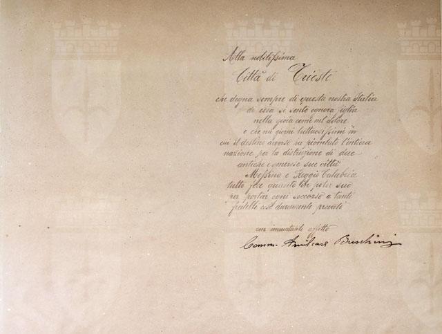 L'albo contiene le fotografie dei sovrani d'Italia, quella del duca d'Aosta, presidente del comitato nazionale di soccorso, quelle dei presidenti della Camera e del Senato Marcora e Manfredi, dei ministri e sottosegretari di Stato con le loro firme autografe, le vedute di Messina e Reggio Calabria prima e dopo il terremoto del 1908. Nella prima pagina vi è un'affettuosa dedica a Trieste. Lo Stato italiano non era intervenuto direttamente: le operazioni di soccorso erano state eseguite da istituzioni come la Croce Rossa. A seguito del cataclisma, Trieste si mobilita a favore delle popolazioni meridionali. Negli organi di stampa italiani, la generosità austroungarica nei confronti delle vittime è spesso omessa, mentre è ampiamente attestata nelle fonti fotografiche presenti in Fototeca. La guerra era nell’aria al punto tale che, quando giungono le prime notizie sulla distruzione di Messina a Roma, si pensa a un bombardamento della flotta austriaca. L’undici luglio 1909, il milanese Leandro Ghisi consegna l’album di ringraziamento al podestà Scipione Sandrinelli, a nome del commerciante milanese Amilcare Boschini, organizzatore di una manifestazione di riconoscenza per quanto il mondo ha fatto in favore dei terremotati.