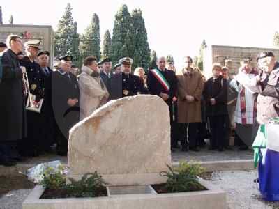 Il sindaco Roberto Dipiazza con gli assessori comunali Roberto Menia e Fulvio Sluga ed il comandante della Capitaneria di Porto di Trieste Paolo Castellani, durante la cerimonia di traslazione dei resti del maro' Spartaco Schergat al cimitero ex militare presso il nuovo monumento eretto dal Comune di Trieste.