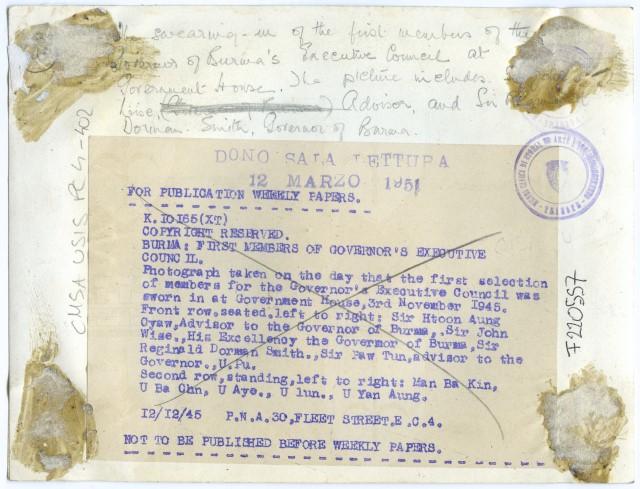 Membri del Consiglio Esecutivo del Governo a Burma. La foto mostra fra gli altri: Sir John Wise, il Consigliere e Sir Reginald Dorman Smith, il governatore di Birmania