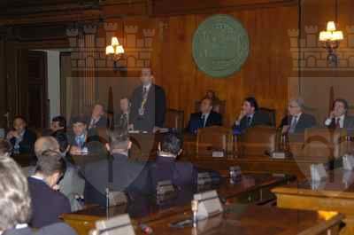 Il sindaco Roberto Dipiazza ed il Presidente del Consiglio comunale Bruno Sulli ed l'assessore comunale Maurizio Bucci con il presidente di Round Table Italia Maurizio Giudici e gli altri rappresentanti presenti al Meeting organizzato dalla Round Table Italiana in collaborazione con il Comune di Trieste, durante l'incontro avvenuto nella sala del Consiglio del Municipio.
