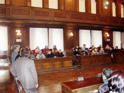Il presidente del Consiglio Comunale Bruno Sulli e gli insegnanti in piedi, gli studenti seduti nei banchi della sala del Consiglio Comunale