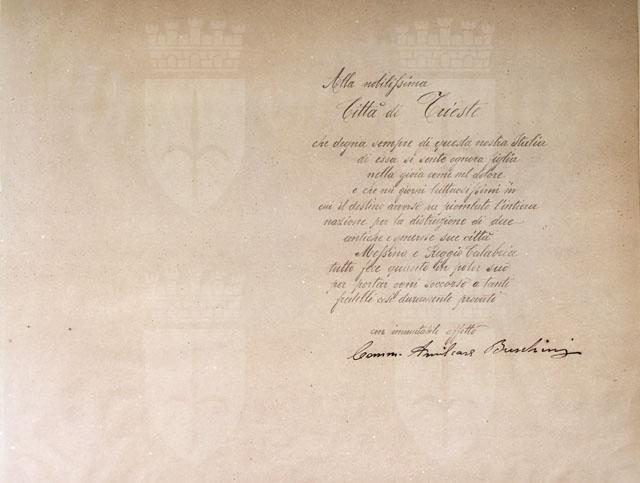 L'albo contiene le fotografie dei sovrani d'Italia, quella del duca d'Aosta, presidente del comitato nazionale di soccorso, quelle dei presidenti della Camera e del Senato Marcora e Manfredi, dei ministri e sottosegretari di Stato con le loro firme autografe, le vedute di Messina e Reggio Calabria prima e dopo il terremoto del 1908. Nella prima pagina vi è un'affettuosa dedica a Trieste. Lo Stato italiano non era intervenuto direttamente: le operazioni di soccorso erano state eseguite da istituzioni come la Croce Rossa. A seguito del cataclisma, Trieste si mobilita a favore delle popolazioni meridionali. Negli organi di stampa italiani, la generosità austroungarica nei confronti delle vittime è spesso omessa, mentre è ampiamente attestata nelle fonti fotografiche presenti in Fototeca. La guerra era nell’aria al punto tale che, quando giungono le prime notizie sulla distruzione di Messina a Roma, si pensa a un bombardamento della flotta austriaca. L’undici luglio 1909, il milanese Leandro Ghisi consegna l’album di ringraziamento al podestà Scipione Sandrinelli, a nome del commerciante milanese Amilcare Boschini, organizzatore di una manifestazione di riconoscenza per quanto il mondo ha fatto in favore dei terremotati.