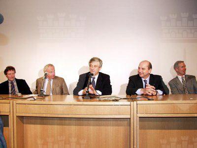Presenti sul palco nell'auditorium del Museo Revoltella il sindaco Dipiazza, i figli Bruno e Tito, l'onorevole Gianni Rivera, l'allenatore Cesare Maldini, il giornalista Bruno Pizzul, il presidente della Camera di Commercio Paoletti