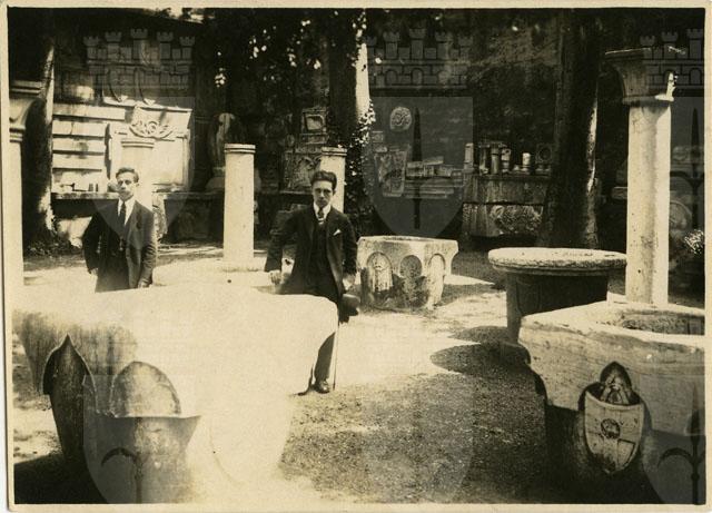 Oscar de Incontrera e suo padre Massimiliano fotografati presso il secondo ripiano dell'Orto Lapidario del Museo di Storia ed Arte di Trieste, tra le vere da pozzo.