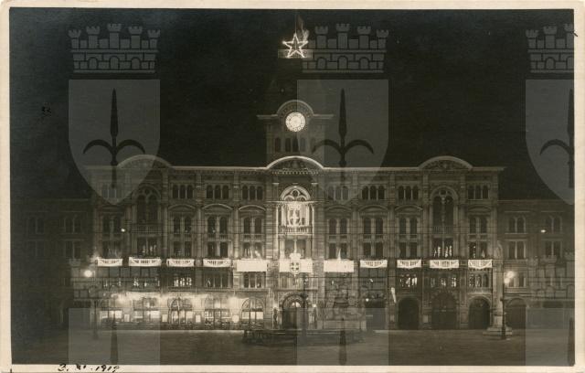 Illuminazione notturna del palazzo del Municipio in occasione del I anniversario della redenzione di Trieste.