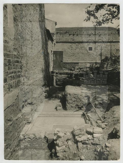 Trieste. S. Giusto : Lastre di pietra romane sul fianco esterno della navata