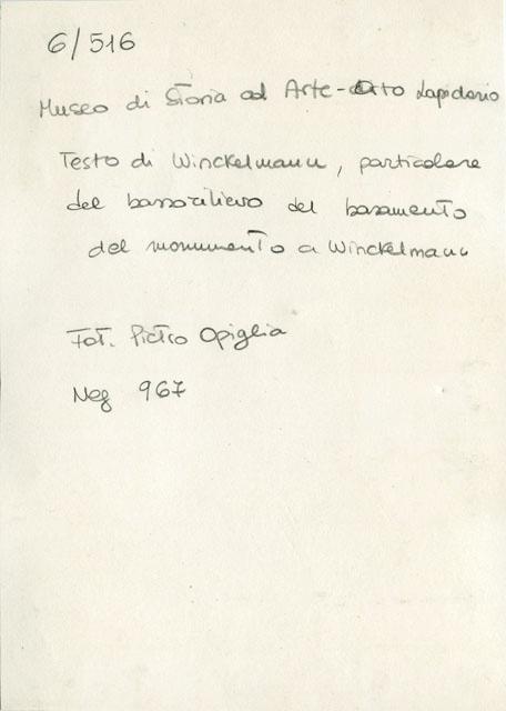 Particolare del rilievo posto alla base del cenotafio di Johann Joachim Winckelmann (Stendal, 9 dicembre 1717 - Trieste, 8 giugno 1768) situato presso l'Orto Lapidario di Trieste. Il monumento, fortemente voluto da Domenico Rossetti per onorare la memoria dello studioso tedesco che morì assassinato a Trieste mentre era in attesa dell'imbarco per proseguire il suo viaggio da Vienna a Roma, fu realizzato dallo scultore Antonio Bosa a seguito dell'approvazione del progetto da parte di Antonio Canova e venne inaugurato il primo marzo 1833. Il cenotafio è costituito da un sarcofago su cui è adagiato un genio malinconico che si appoggia con l'avambraccio su un tondo contenente il ritratto del defunto. Alla base vi è un rilevo con un filosofo togato, visibile nella fotografia, probabilmente da identificare con lo stesso Winckelmann, che indica le antichità alle personificazioni delle Arti (Pittura, Scultura, Architettura), seguite da Storia, Critica, Filosofia e Archeologia.