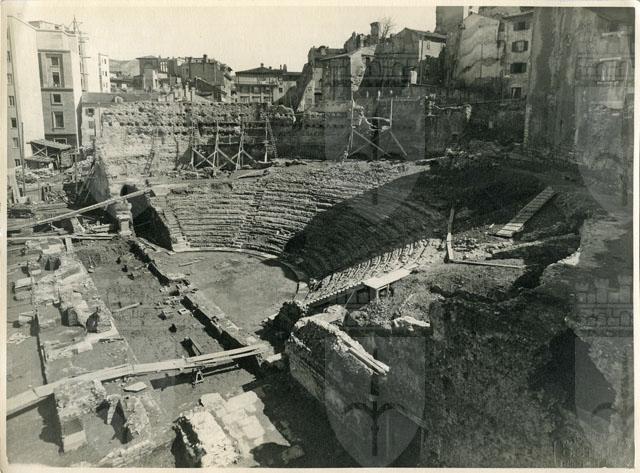 Il teatro romano di Trieste in fase di scavo. La foto è stata scattata durante l'ultimo periodo di scavo, in prossimità dell'inaugurazione del monumento avvenuta il 21 aprile del 1938. Il teatro è infatti quasi interamente alla luce, la cavea e l'orchestra sono visibili, si sta invece completando la rimozione dell'interro in corrispondenza dell'iposcenio, dove si nota ancora la presenza di uno spesso riporto.