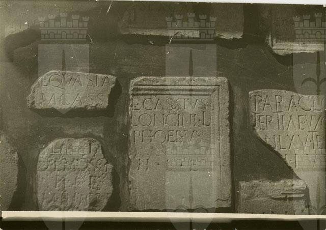 Lapidi romane murate nell'Orto Lapidario del Museo civico di Storia ed Arte di Trieste. La lastra posizionata in alto a sinistra reca l'iscrizione: [---] Equasia [---] M(arcus) Cassi[us ---]. L'epigrafe sottostante recita: [F]laccia (mulieris)) l(iberta) Mosch[is], h(ic) s(ita) e(st). [L(ocus)] m(onumenti) in agr(um) p(edes) [---], in f(ronte) [p(edes) ---]. La centrale porta l'iscrizione: L(ucius) Cassius Longini l(ibertus) Phoebus/ph(ic) s(itus) e(st). In quella di destra, invece, si legge: P(ublius) Araclovi[us] Tertiae, uxori suae, [a]n(norum) LXV, testam(e)nto [fier]i iussit.