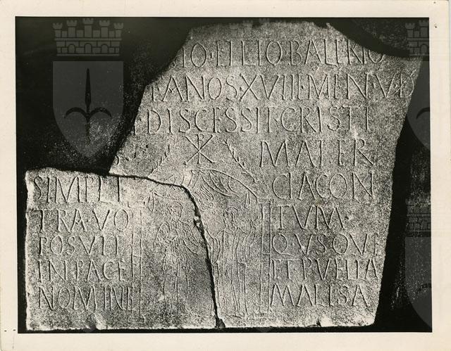 Lapide cristiana rinvenuta ad Aquileia presso la Beligna. La lapide apparteneva alla collezione del facoltoso farmacista triestino Vincenzo Zandonati che fu acquistata dal Comune di Trieste nel 1870 e andò a costituire il primo nucleo del nascente Museo Civico di Storia ed Arte della città. La lapide, ricomposta con due frammenti, conserva parte dell'iscrizione originaria, che recita: [---]io filio Balerio [qui vixi]t anos XVIII, men(ses) V d(ies) [--- qu]i discessit Cristi [servus] mater Simplicia con= tra votum posuit qu(e)sque in pace et puella nomine Malisa. Il testo dell'iscrizione è interrotto dalla raffigurazione di un uomo e di una donna, ritratta nella posizione dell'orante, stanti sotto un'architettura definita da due colonne che sorreggono un arco a cui sono appesi tendaggi. Tra le figure vi è l'immagine di una colomba, sopra l'architettura campeggia il cristogramma tra rami di palma. L'iscrizione si data nella seconda metà del IV sec. d.C.