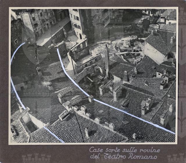 Foto scattata dalla sommità del grattacielo nel 1937, alla vigilia degli scavi per il recupero del teatro romano. La foto mostra le case sorte sui resti del teatro nell'area di Riborgo e Donota in Cittavecchia che verranno abbattute per riportare alla luce il monumento. Le linee bianche identificano il tracciato delle murature antiche rispettato dalle soprastanti costruzioni.