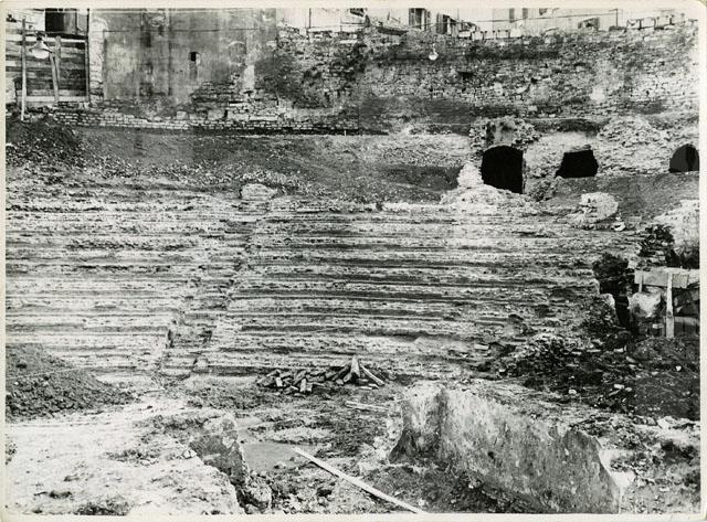 Scavo del teatro romano in Cittavecchia, tra le aree di Riborgo e Donota. La foto inquadra l'estremità occidentale della cavea, di cui sono stati messi in luce il muro perimetrale, la "summa cavea", il "vomitorium", la "praecinctio" e gran parte dell'"ima cavea". Il tratto di gradinata ripreso nella foto si colloca tra il quarto e il quinto "scalaria" partendo da est. In primo piano, nell'area dell'orchestra, vi sono alcuni resti degli edifici moderni che verranno demoliti per portare in luce le strutture antiche.