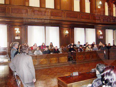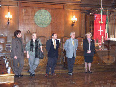 Il presidente del Consiglio Comunale Bruno Sulli e gli insegnanti in piedi, gli studenti seduti nei banchi della sala del Consiglio Comunale