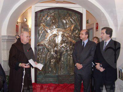 Primo piano della porta della pace, il sindaco Roberto Dipiazza, Roberto Menia, Giorgio Rossi e Padre Aldo Tonini
