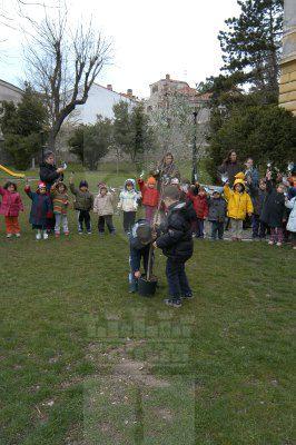 Angela Brandi e padre Paolo Rakic assieme ai bambini della scuola ed all'alberello di ulivo