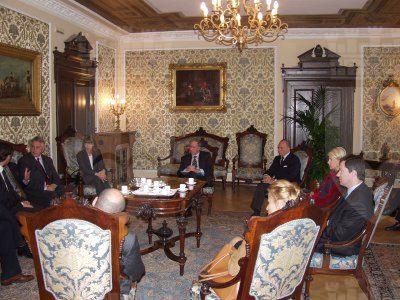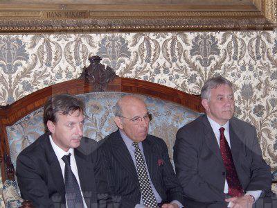 Gli assessori comunali Maurizio Bradaschia e Giorgio Rossi assieme agli assessori regionali Sergio Dressi, Federica Seganti e Franco Franzutti durante l'incontro con l'ambasciatore olandese Ole Philipson, nel salotto azzurro del Municipio.