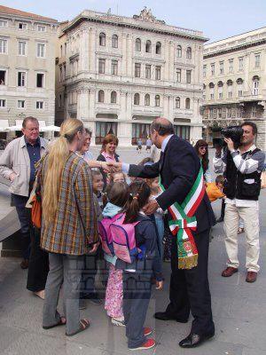 Roberto Dipiazza, sindaco intrattiene i bambini che assistevano all'incontro con i ciclisti della polizia in piazza dell'Unita' d'Italia : Trieste : 2002